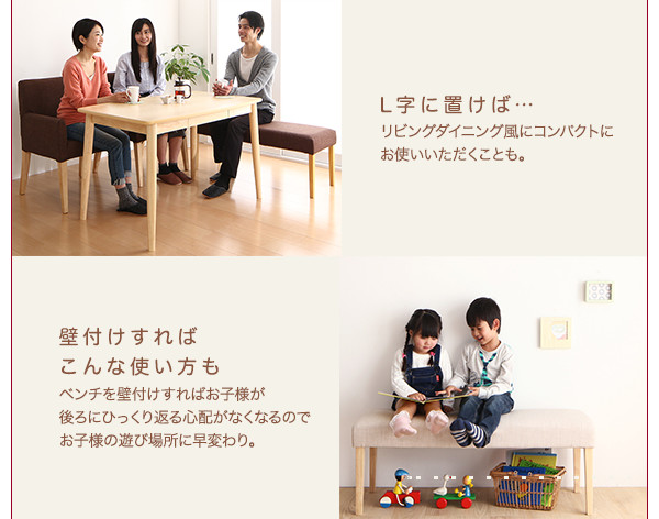ソファのようにしっかりした座り心地のチェアを採用。また、お子様の座席としてや単品使いでも活躍するベンチもご用意。チェア・ベンチは共にカバーリング仕様となっており、汚れたらサッと洗えて衛生的。小物収納に便利な引き出し付きのテーブル。お部屋に合わせて選べる2サイズ。