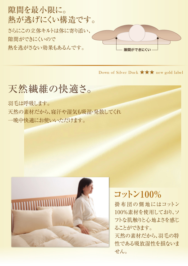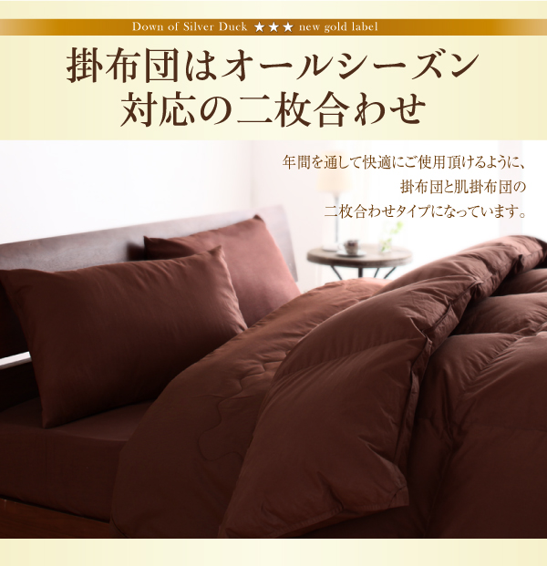 寝具が一式揃う、羽毛布団8点セット(ダブルサイズ以上は10点セット)。掛布団には空気をたっぷり含み、ふんわりあたたかい寝心地の羽毛掛布団を採用。敷布団やカバー類、枕まで、必要な物をセットにしました。敷布団、敷カバーが、敷パッド、ボックスシーツに変更になったベッドタイプもご用意。