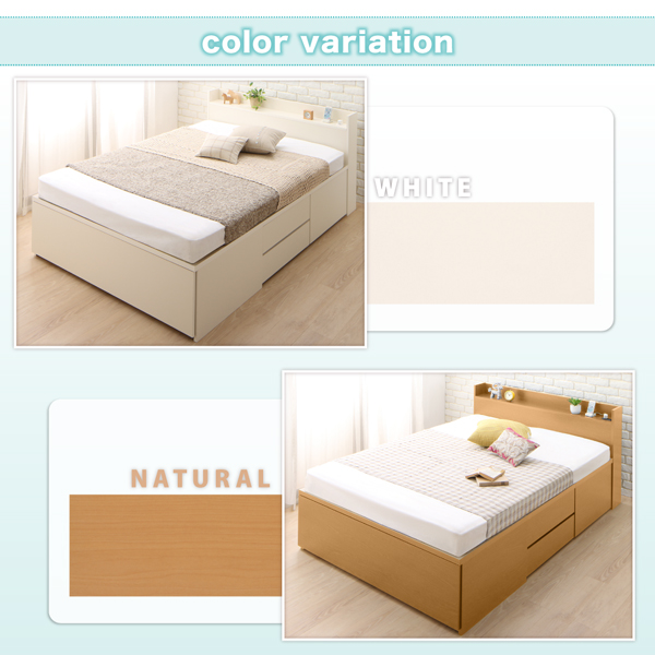 大物も片付く、ワイド深型引き出し収納をフット側に備えたチェストベッド。サイドには深型・浅型の引き出し3杯を完備。さらに、丈夫でホコリの入りにくいBOX構造を採用。宮棚、コンセントを備えたヘッドボードは機能的で、使い勝手の良い仕上がりです。