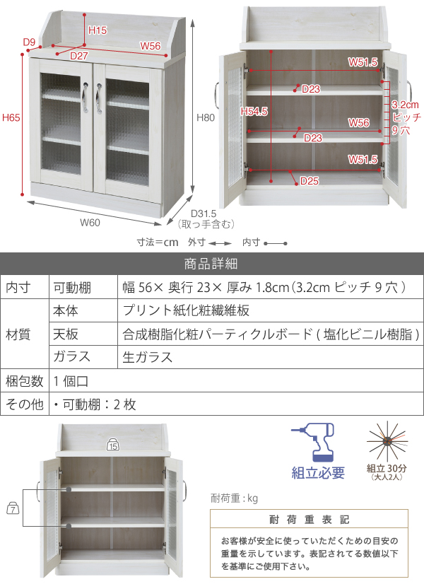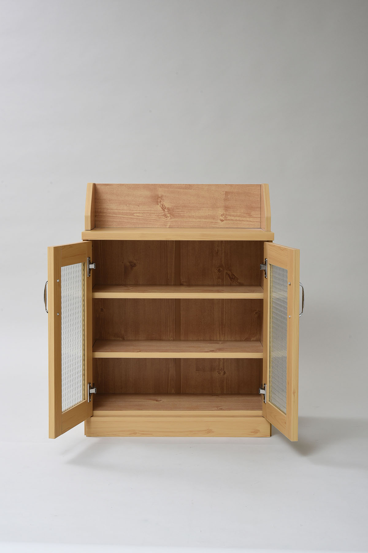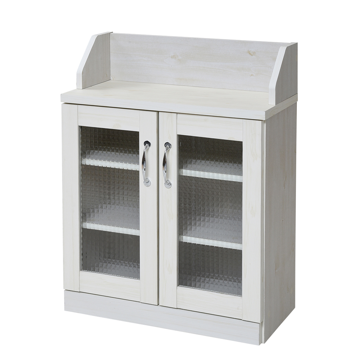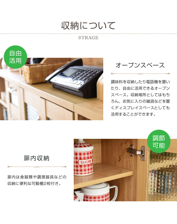 カウンター下を有効活用できる、カウンター下収納シリーズのキャビネットタイプ。フレンチカントリー調のオシャレなデザイン。天板部はオープンスペース収納として活躍。ガラス扉付き棚収納を完備。可動棚を採用しており、収納物に合わせて調節が可能。