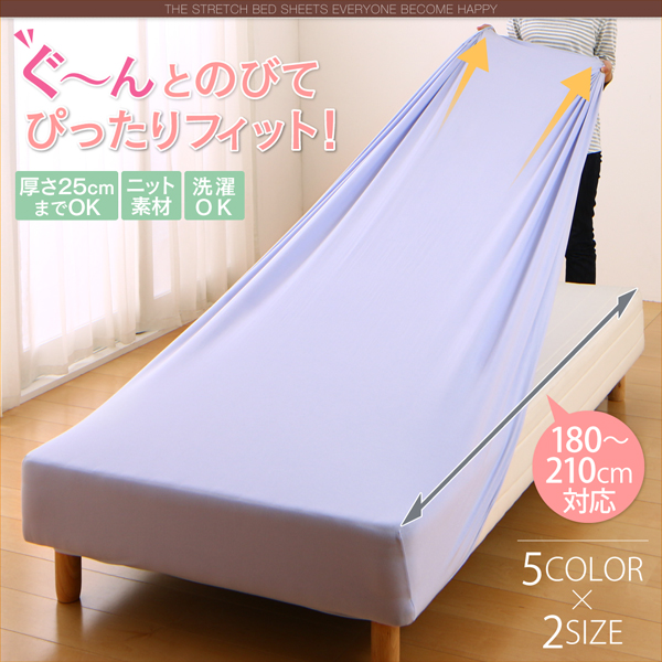 縦横に伸縮して幅広いサイズに対応できるシーツ。肌になじみやすく心地よいニット地タイプです。縦にも伸びるので、ショート丈やロング丈にもしっかりフィット。また、マットレスだけでなく敷布団のシーツとしても活躍。ウォッシャブル仕様でシワになりにくいのでお手入れも簡単。