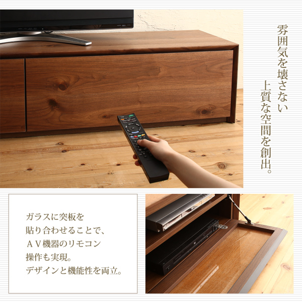 天然木を使用しており、世界に一つしかない木目が楽しめるテレビボード。デッキ収納と引き出し収納を完備。デッキ収納部はガラスに木目の突板を貼ることにより、デザインを損なうことなく、リモコンの操作が可能な設計。カラーはウォルナットとオークをご用意。サイズは幅180と幅200の2サイズをご用意。組み立ての苦手な方に嬉しい完成品でのお届けです。