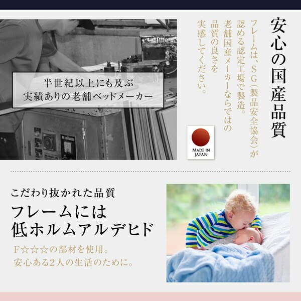 国産 コンセント・照明付 カップルにうれしいフロアベッド 高さを抑えたフロアタイプのベッドです。ベッドの圧迫感を軽減し開放的な印象になります。ヘッドボードにはライト、宮棚、コンセントに加え、間仕切りを備えている点が特徴です。フレーム部分は革張り仕様で丸みのある仕上がり。こだわりのマットレスセットで快適な寝心地が楽しめます。
