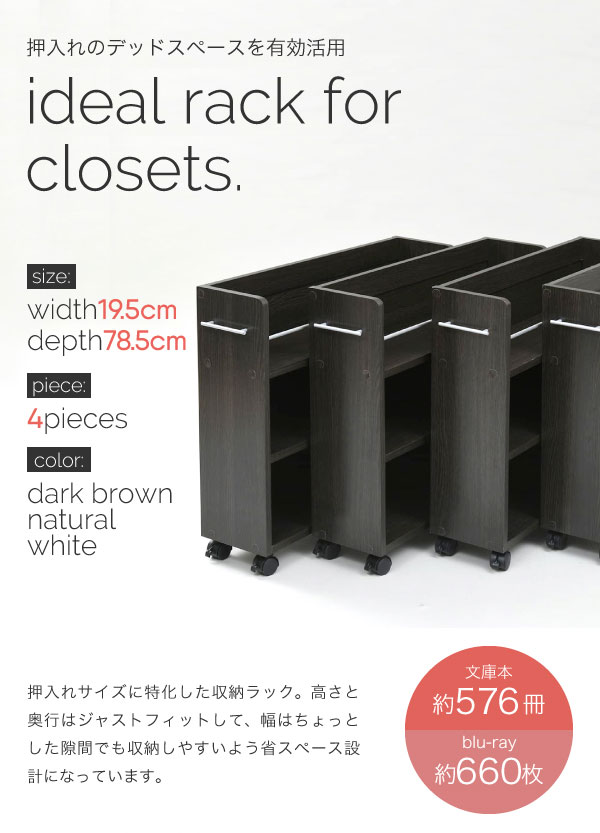 押入れスペースを効率的に使いたい方におすすめなのが、幅19.5cm・奥行78.5cmの4個組タイプの押入れ用ラック、SGT-0130SETです。一般的な押入れに収まるサイズで、設置も簡単です。可動棚を備えているため、収納する物に合わせて棚の位置を調整できます。キャスターや取っ手も付いているため、押入れの中でも移動や取り出しが容易です。このラックを使うことで、押入れ内のスペースを有効に利用し、整理整頓ができます。限られたスペースをうまく使いたい方におすすめです。