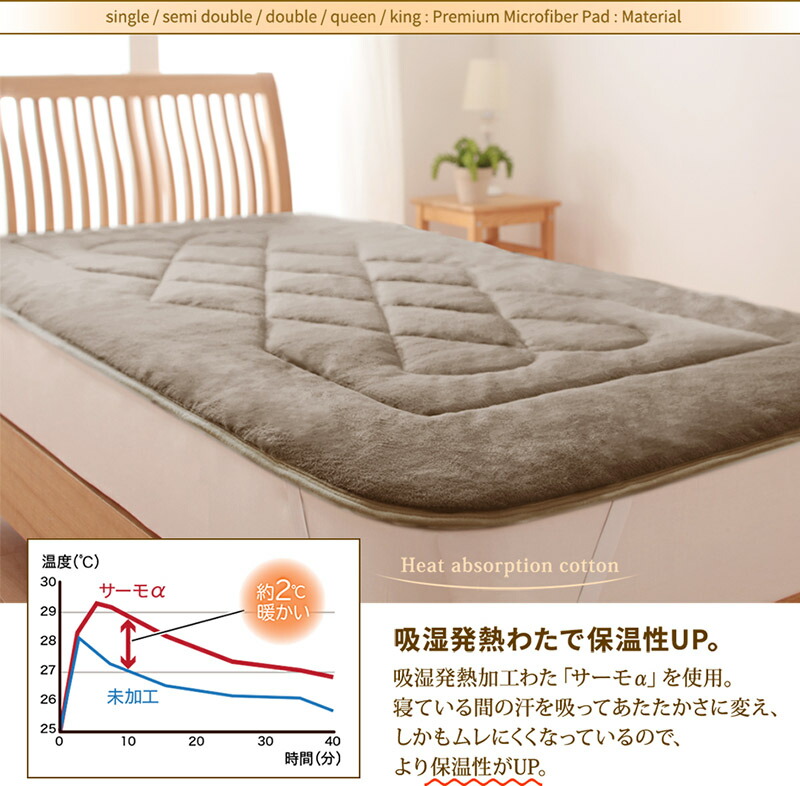 寒い季節にぴったりのプレミアムマイクロファイバー敷きパッドをご紹介します。従来のマイクロファイバーに比べ、繊維を細くすることで、よりしっとり、なめらかな肌触りとともに、保温性がアップしました。毎晩の睡眠を快適に過ごせるよう、優れた機能性を持っています。単品の敷きパッドはもちろん、まとめ買いに便利な2枚セットもご用意しています。洗濯機で簡単にお手入れできるので、清潔さを保つこともできます。この敷きパッドを使えば、毎晩の睡眠がより快適になります。豊富なサイズ展開もあり、シングル、セミダブル、ダブル、クイーンサイズ、キングサイズなど、あらゆるベッドに対応しています。快適な眠りを求める方におすすめの敷きパッドです。