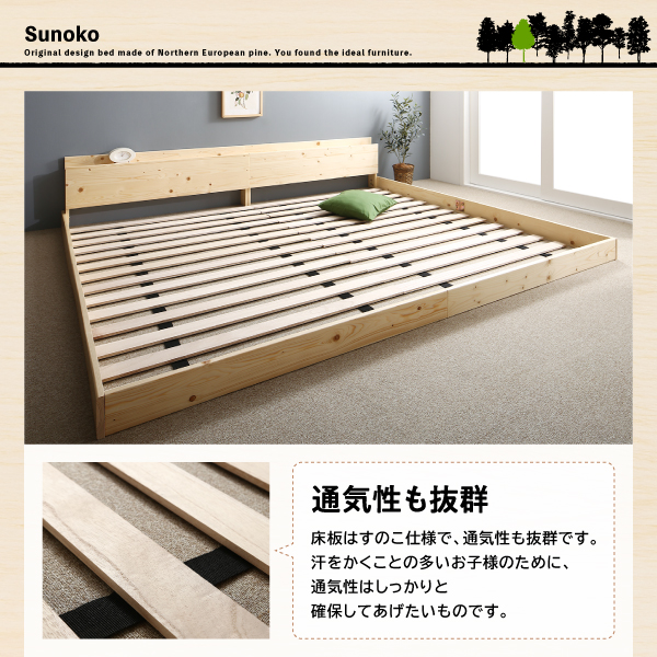 家族が一緒に寝られる天然木ファミリーベッド FLEETWOOD フリートウッド 最大約280cm幅のベッドをご用意しており、家族で一緒に眠ることができます。2台のベッドを連結して大きなベッドを実現しており、別売りのサイドフレームを組み合わせていただくと2台に分けて使うこともできます。大きなベッドの圧迫感を軽減するフロアタイプです。ヘッドボードには宮棚、コンセント付きです。