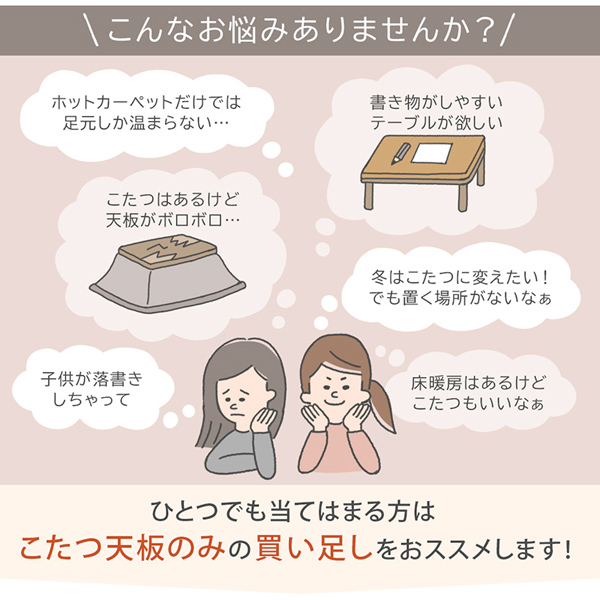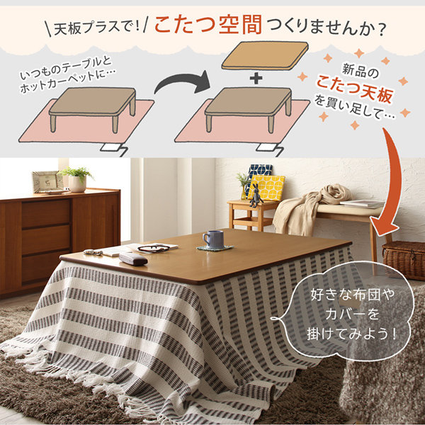 テーブル天板のみの単品販売品です。既にお持ちのテーブルやホットカーペットなどに組み合わせてお使いいただく商品です。カラーの異なる両面が使えるリバーシブル仕様です。