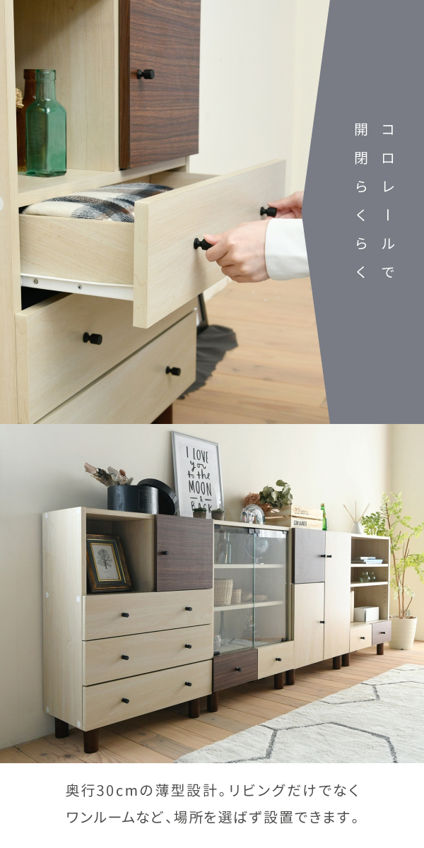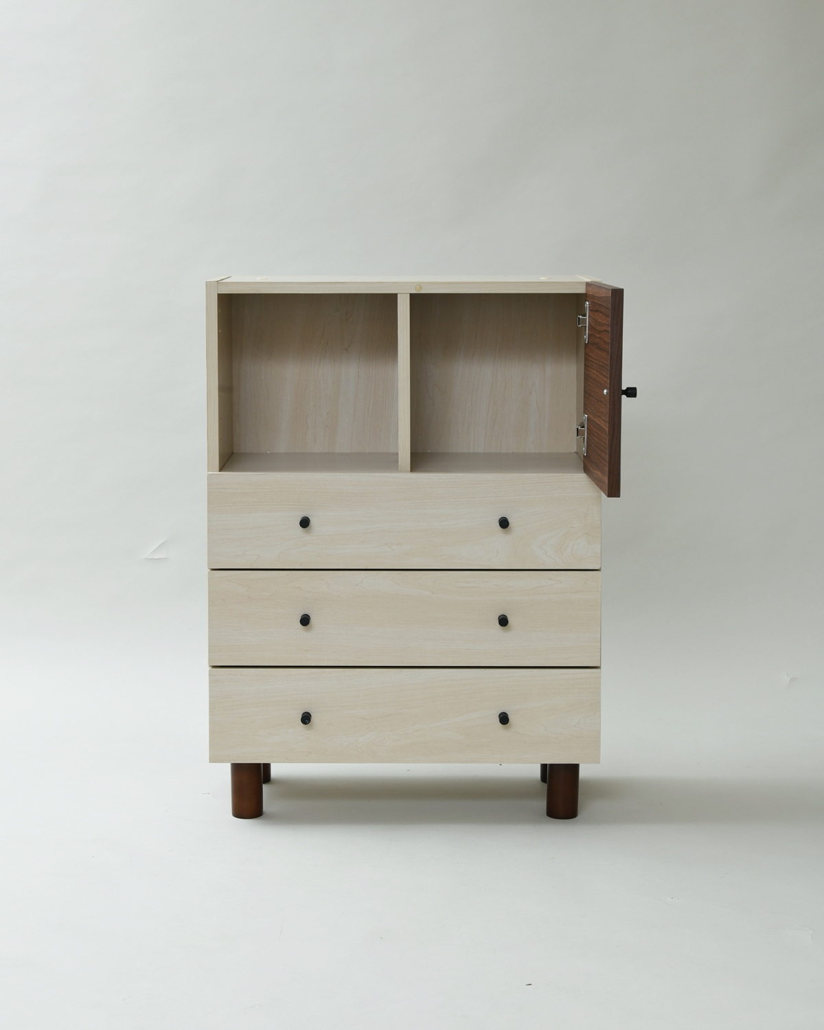 Two-tone BOX series マルチチェスト FMB-0004 木目のナチュラルとダークブラウンを組み合わせたツートーンカラーの収納家具シリーズです。このページはマルチチェストタイプの販売ページです。オープンラック、扉付き棚、引き出し3杯の収納を備えています。