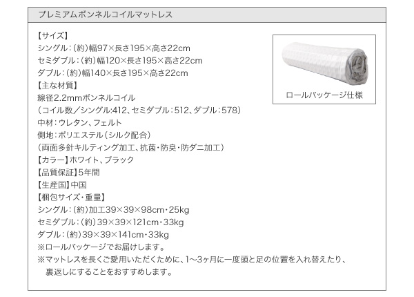プレミアムボンネルコイルマットレス付き / セミダブル / ナチュラル / ホワイト [No.100000137]