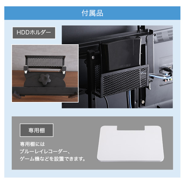 壁寄せテレビスタンド ロー固定タイプ 専用棚セット Fenes フェネス 省スペースでスタイリッシュな壁寄せテレビスタンド、ロー固定タイプ 専用棚セットです。配線などは背面に収納できて、スタイリッシュな印象を壊しません。6段階の高さ調整機能を搭載しています。レコーダーやゲーム機が設置できる専用棚セットです。HDDホルダーが付属します。