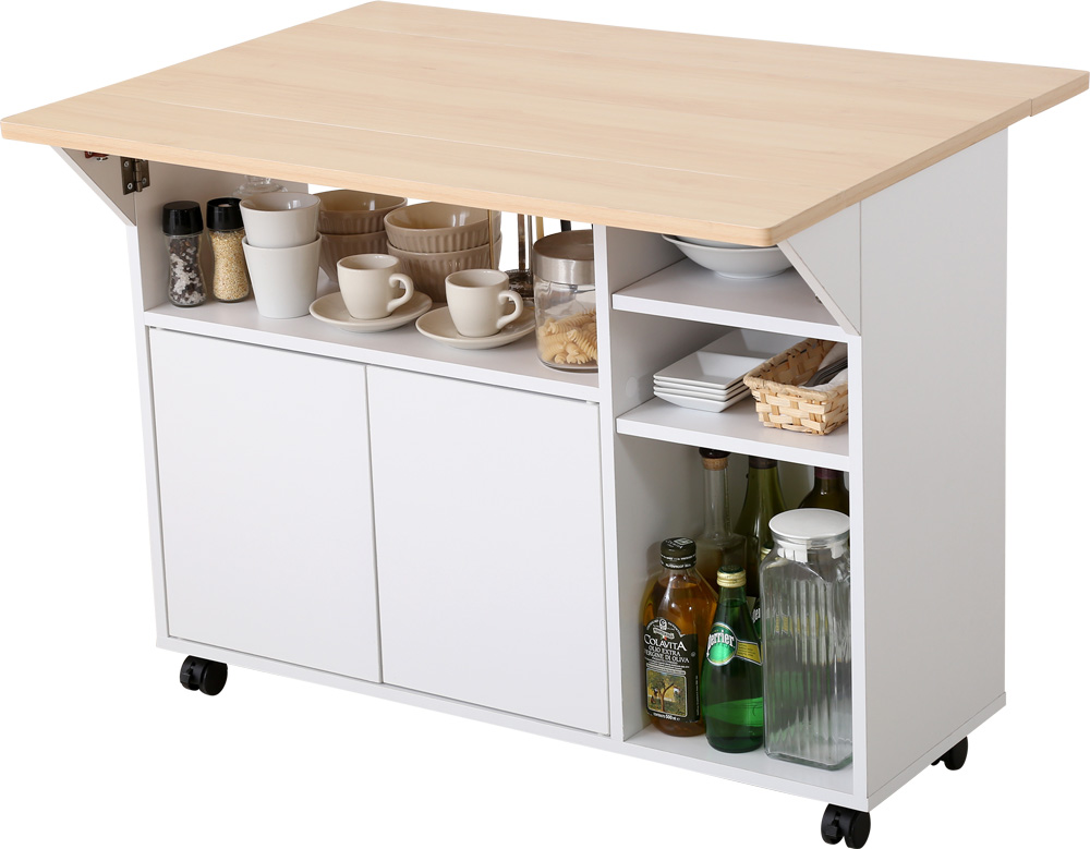 バタフライキッチンワゴン Chane シャーネ テーブルとしても使えるバタフライキッチンワゴンです。折りたたみ式で天板の広さを変えられます。オープン収納、目隠し扉収納などの収納スペースを備えています。移動が簡単に行えるキャスター付き。