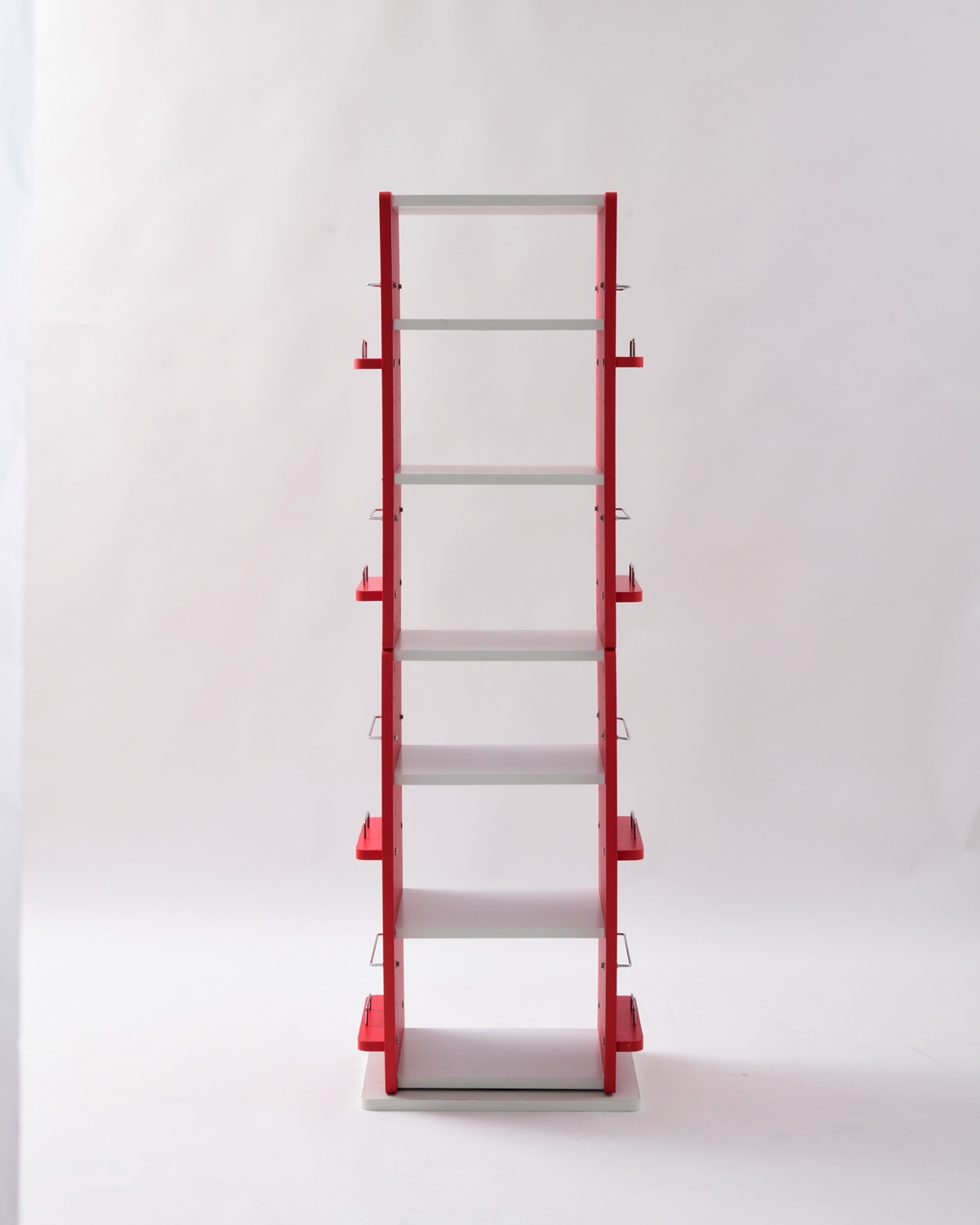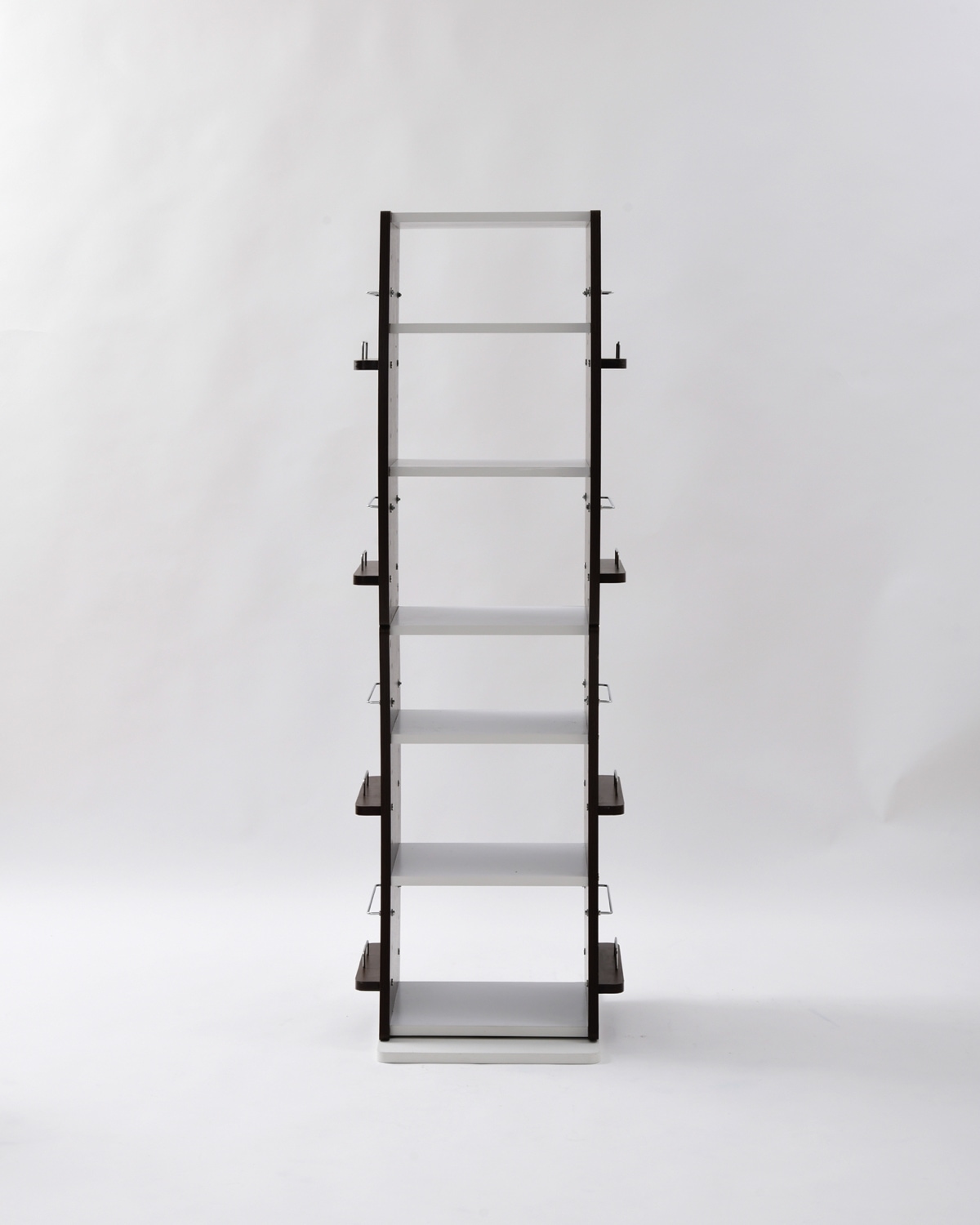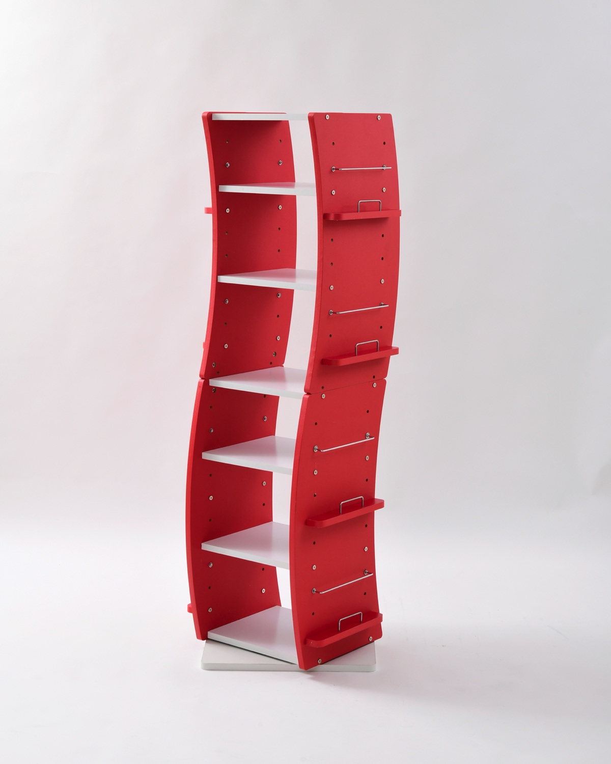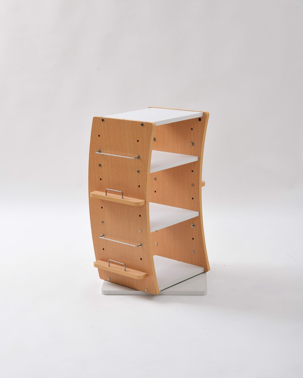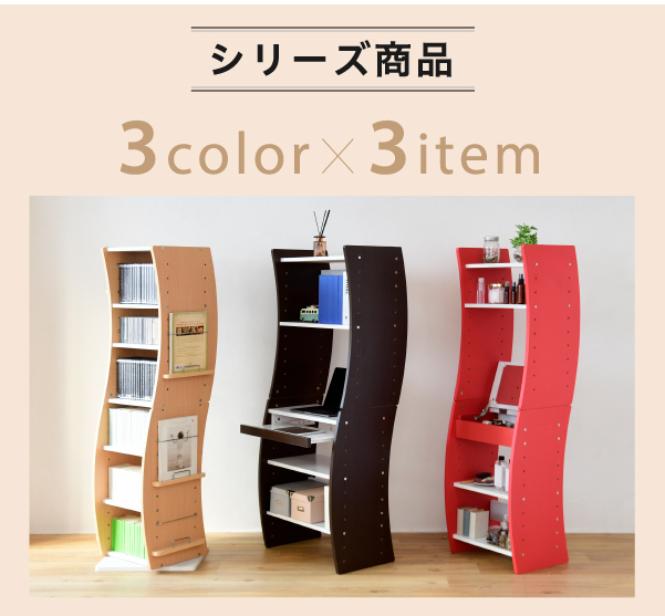 360度回転ラック wavy FWD-0209 くるくる360度回転する便利なラックです。大容量の棚収納、サイドにディスプレイエリアを備えています。棚は収納物に合わせて高さ調節ができます。曲線を描く特徴のあるデザイン。省スペースなスリム設計。分割しての使用が可能です。
