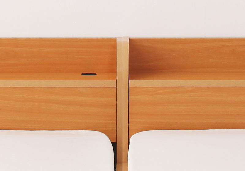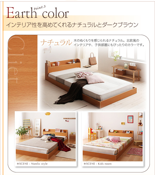 高さを抑えたフロアタイプのベッド。お部屋を広く、開放的に演出します。使い勝手のよいシンプルな棚、便利なコンセント付きのヘッドボードです。ベッドフレームはナチュラル、ダークブラウンの2色展開です。