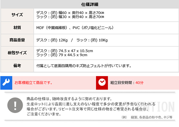 下記ダウンロードボタンから、「シンプルデスク60cm幅+サイドラック30cm幅セット LULUTE ルルテ」の組立説明書(PDF形式)をダウンロードできます。