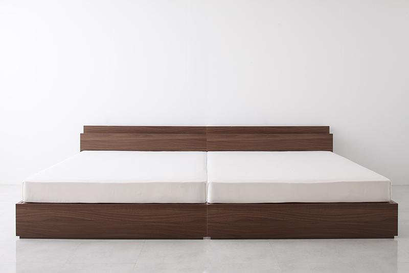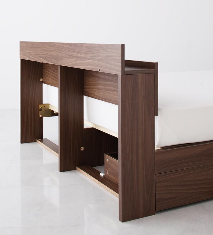 本、時計、スマートフォンなどをスッキリ置けるシンプルな宮棚と、2口コンセント付きのヘッドボード。ベッドの下には左右どちらにも取り付けられる、2杯の引き出し収納付き。デッドスペースを有効活用できます。美しい木目のウォルナット柄を採用したフレームも魅力的。