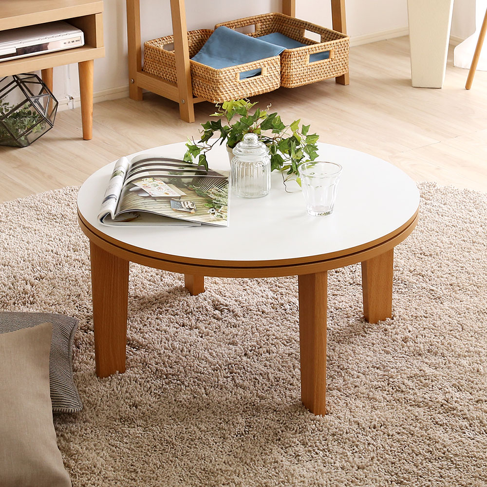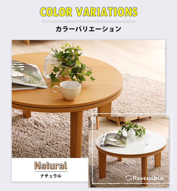 木目調 カジュアル リバーシブル こたつ 70cm幅 丸形 単品 Frank HTR70J ウォールナット ナチュラル 両面が使えるリバーシブル天板です。お部屋を選ばない木目調で、オールシーズン活躍します。1年間保証付きのヒーターを採用しています。
