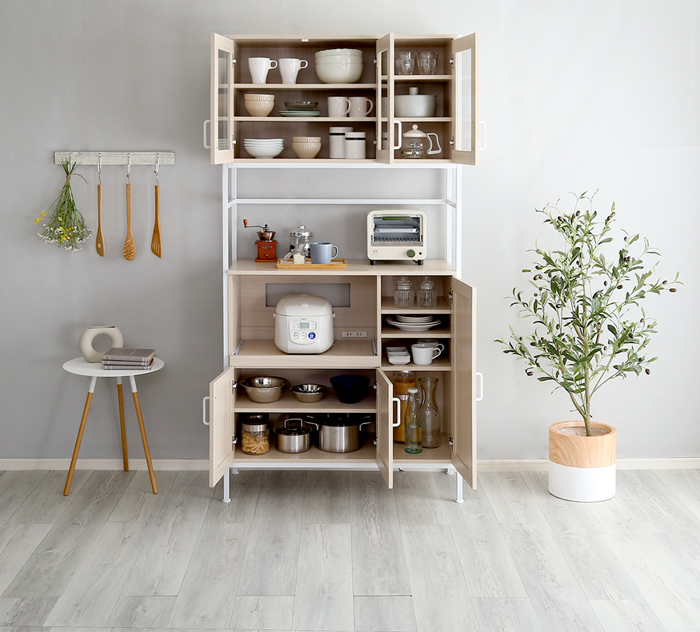 さわやかなオシャレ食器棚 Frais フレ FRA-1890 ガラス扉収納、オープン収納、スライド棚収納、扉付き収納を備えた、大容量なキッチン収納家具です。キッチンシリーズFrais、食器棚w93.5cmタイプ。