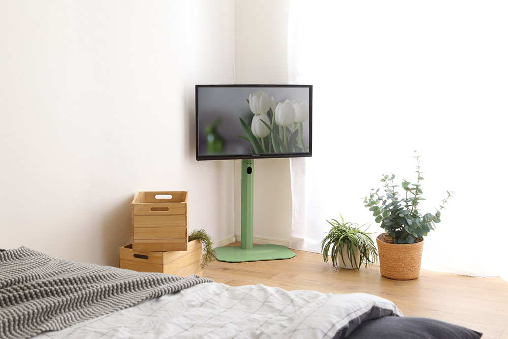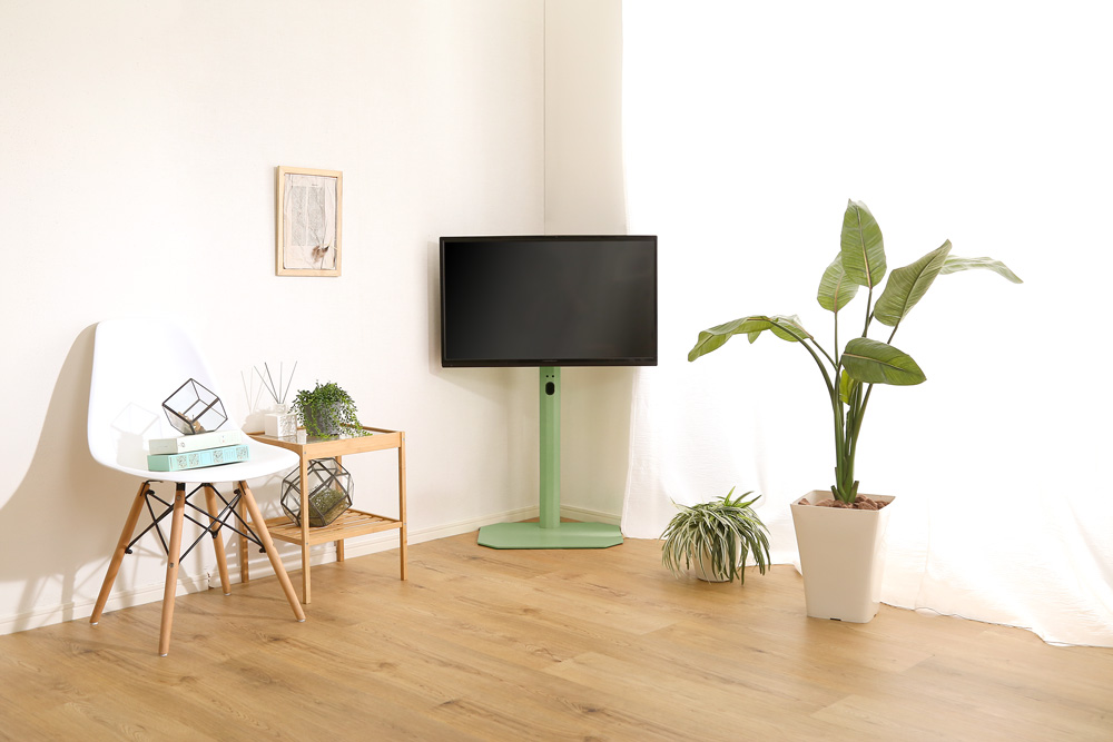 八角壁寄せテレビスタンド ロータイプ ハードディスクホルダーセット Vihrea ヴィフレア 北欧インテリアシリーズ。八角形の床板により、壁やコーナーにフィットするテレビスタンドのロータイプ(専用ハードディスクホルダーセット)です。支柱はコードを通せる仕様となっており、コードを隠すことができます。240度のワイドスイング機能を搭載しています。