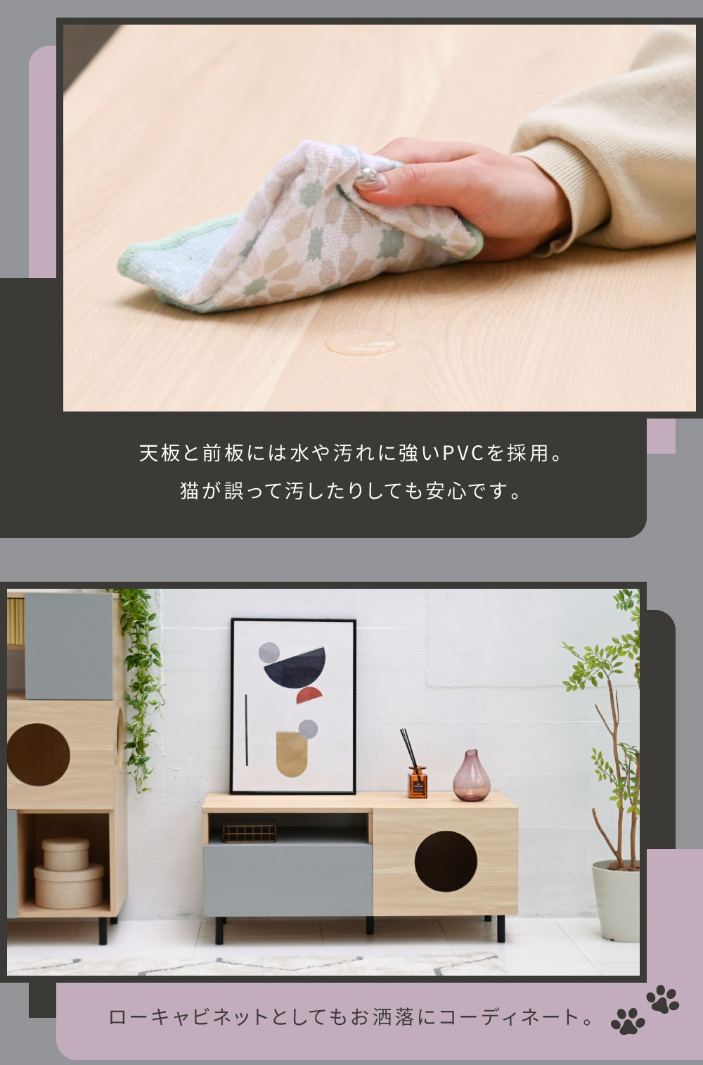 猫家具シリーズ Pisica 猫と暮らすテレビ台 FNK-0001 猫用スペースをプラスした、愛猫と暮らす家具シリーズPisica。テレビ台のご紹介。木目調ナチュラルとグレーのツートーンデザイン。オープンラック。引き出し収納。扉内は猫ちゃんスペース