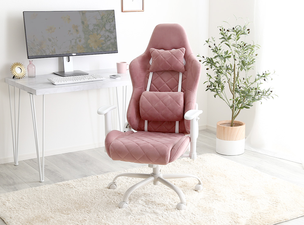 大人かわいいゲーミングチェア Louise ルイーズ OK-GGC くすみカラーで彩られた洗練されたデザインのゲーミングチェアです。肌触りの良いスエード調の生地と、長時間座っても疲れないふかふかな座面が、くつろぎと快適性を提供します。無段階リクライニングが可能で、ロッキング機能も搭載されています。