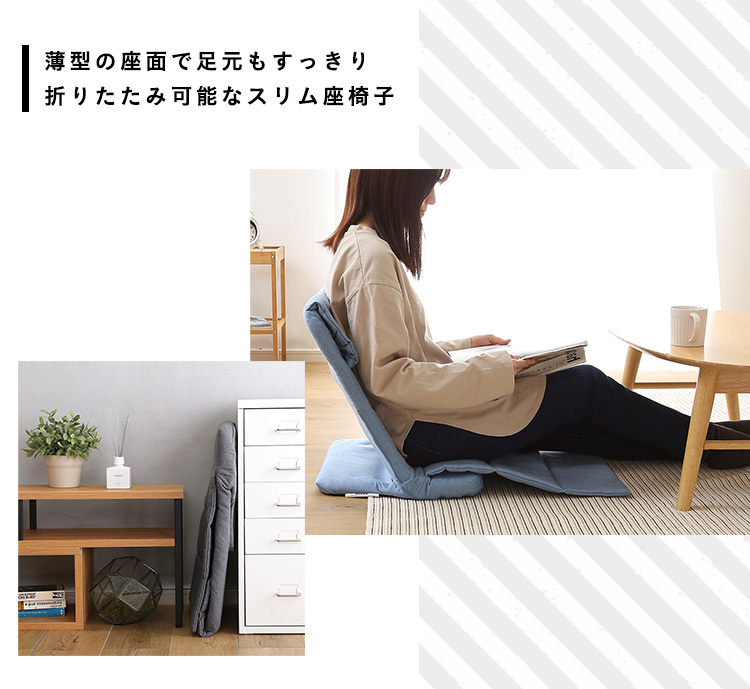 折りたたみスリム座椅子 ロータイプ Olika オリカ SH-06-LSZ 折りたたみ可能なスリム座椅子であり、ミドルバック仕様のロータイプです。リクライニング仕様で、背もたれは42段階のギアで細かく調整可能です。床の上だけでなく、ベッドの上でも快適にお使いいただけます。