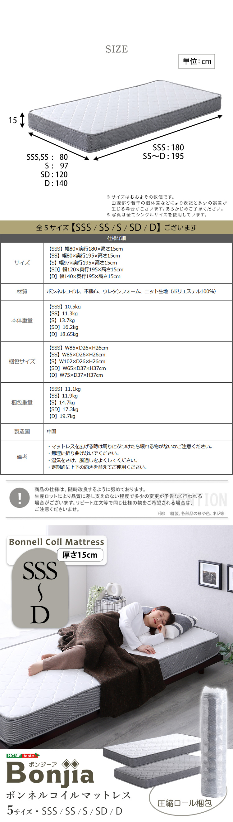 ホテルライクなボンネルコイルマットレス、セミシングルサイズです。硬めの寝心地が特徴のボンネルコイルマットレス。快適な弾力と通気性を持ち、マットレス全体で体をしっかり支えます。表地には速乾性に優れたポリエステル100%のキルティングニットを採用。強度耐久テストをクリアした確かな品質。お子様も安心なノンホルムアルデヒド製品です。ロール梱包でお届けしますので、搬入が楽に行えます。ホワイト、シルバーの2色から選べます。