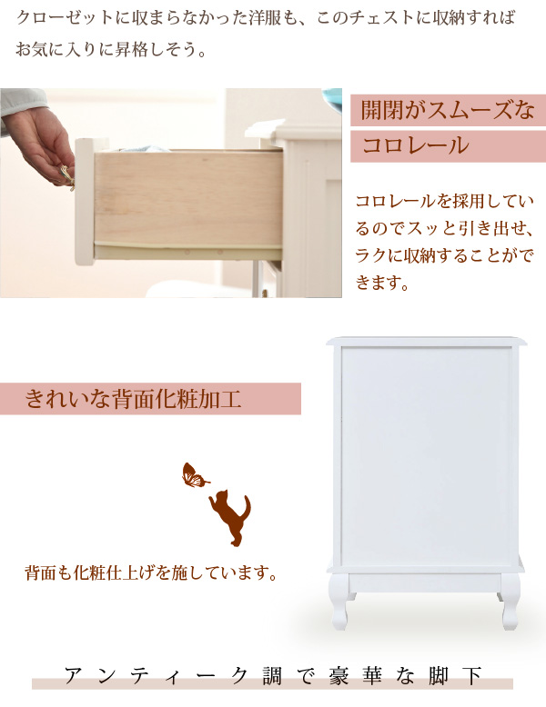 女の子のお部屋にピッタリな、愛らしいデザインのチェスト。4段引き出しのコンパクトサイズ。デザインのポイントは、猫脚、アンティーク調の取っ手、花柄モチーフ。背面まで綺麗な仕上がり。引き出しにはコロレールが付いており、スムーズな開閉を実現。