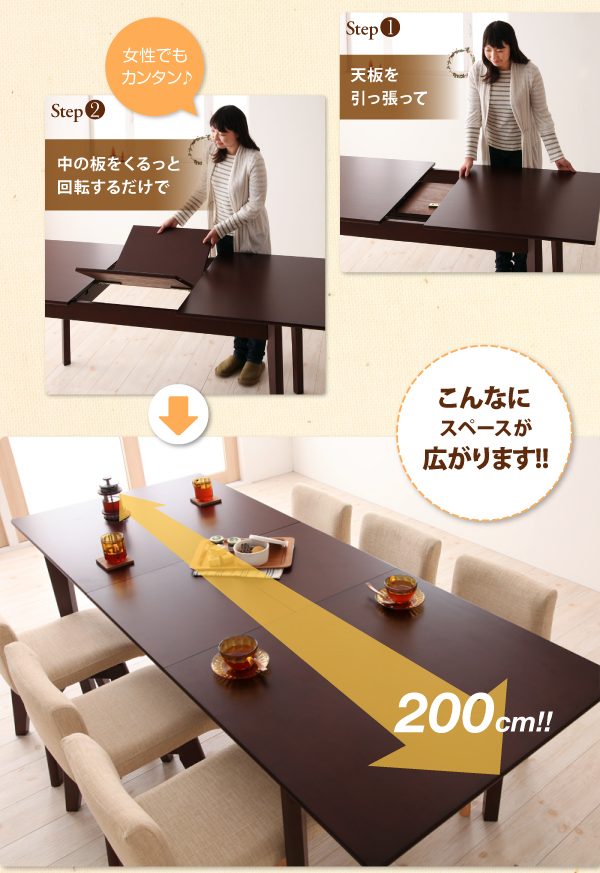 普段は幅約150cm、来客時は幅約200cmのダイニングテーブルに早変わりする、エクステンションダイニングです。テーブル(W150-200)単品、回転チェア(2脚組)単品、ベンチ(W130)単品、4点セット、5点セット、7点セットの豊富な6タイプをご用意しています。ブラウン、ナチュラルの2色からカラーが選べます。