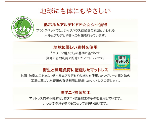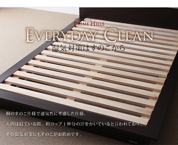 ベッドフレーム、マットレス共にフランスベッド社製の高品質なローベッドです。直線的なデザインはシンプルで現代的な印象です。また、人気のステージタイプデザインを採用しています。日本人に良く合うロータイプのベッドです。圧迫感が少なく広々としたゆとりの空間を演出しゆったりとお過ごしいただけます。通気性に配慮した、桐のすのこ仕様。しっかりと強度を持たせているすのこなので、マットレスだけでなく、布団を敷いてのご利用も可能です。