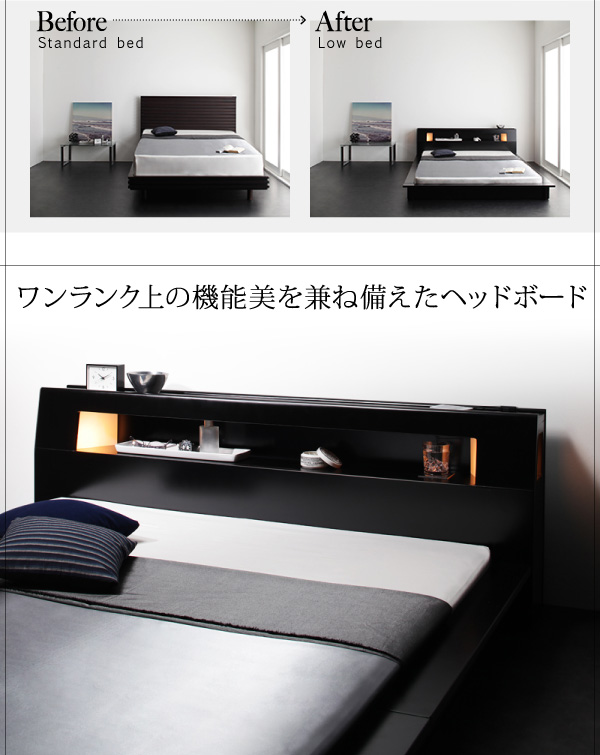 圧迫感が少なく寝室を開放的に演出する、モダンライト・コンセント付きステージフロアベッドです。マットレス外側フレームがステージのように設計された、ステージスタイルデザインです。ヘッドボードには棚収納、2口コンセント、モダンライトを備えています。汚れや傷に強いウレタン塗装仕上げを施しており、楽にお手入れを行っていただけます。