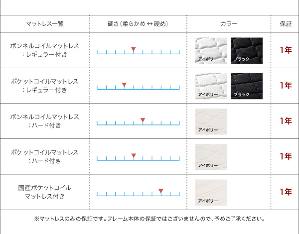 タイプ / サイズ / マットレス カラー