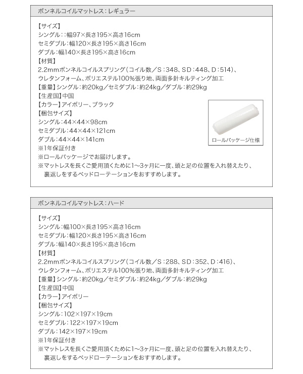 ボンネルコイルマットレス:レギュラー付き / セミダブル / ブラック [No.57492]