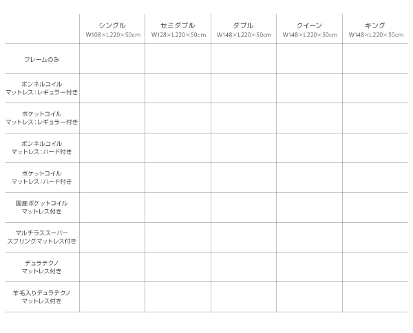 ※サイズやマットレスタイプにより、マットレスが分割仕様(2枚以上の組み合わせ)の場合がございます。詳細はマットレスの仕様をご確認ください。