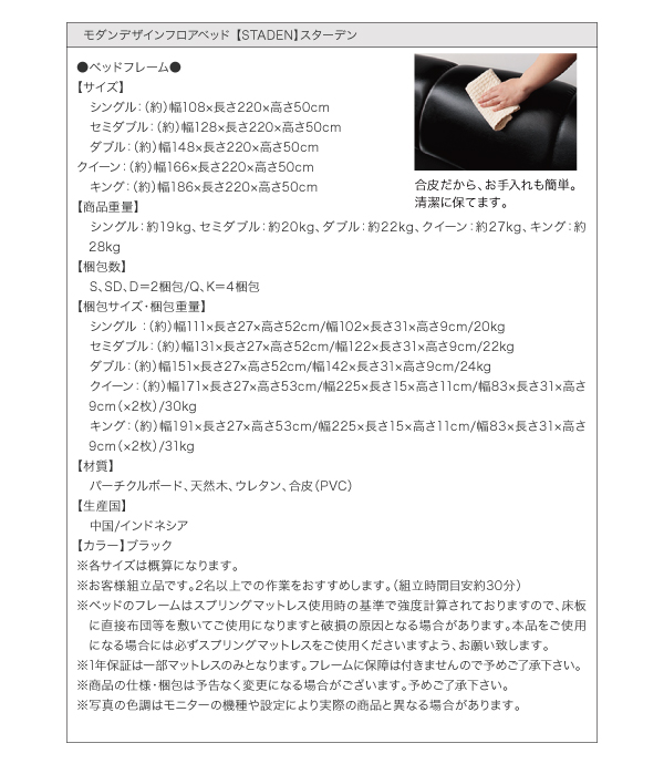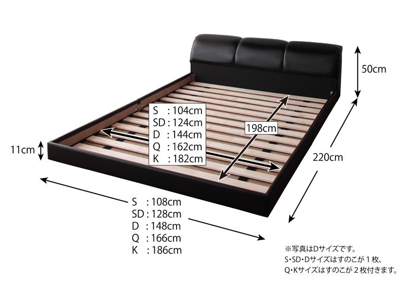 クイーン、キングの大きなサイズも選べる、サイズバリエーション豊富なモダンデザインフロアベッドです。高さの低いロータイプフロアベッドで寝室を広く演出し、開放的にご利用いただけます。ウレタン仕様で、クッション性抜群のヘッドボードに仕上がっています。背もたれとしても活用できるので、ベッドの上を眠る場所としてだけでなく、寛ぎの場所としてご利用いただくことができます。張り地にはレザー素材を採用しており、高級感を高めると共に、簡単お手入れを実現しています。