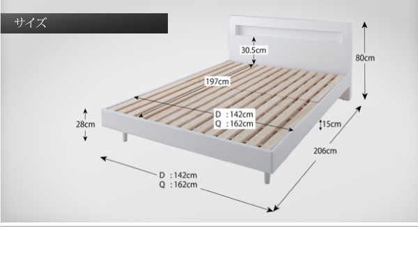 ダブルサイズ、クイーンサイズ、ゆったりと眠れる大きめの2サイズ展開です。円柱状デザインで作られた脚が、デザイン性を高めます。ヘッドボードには、棚と便利な2口コンセントを備えています。フレームにはウレタン塗装仕上げを施しており、汚れや傷に強く、永くご愛用いただけます。