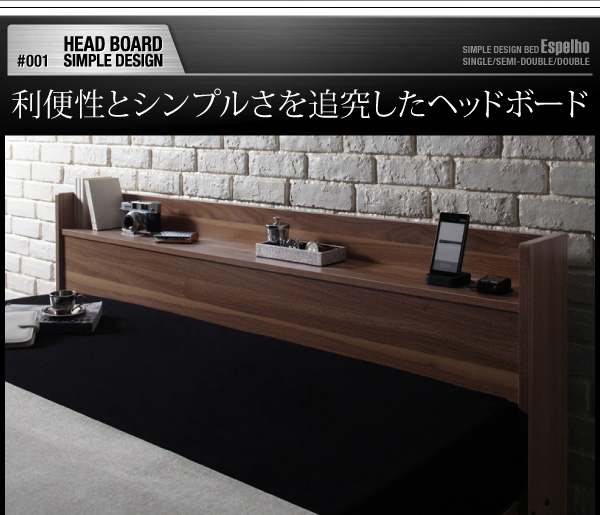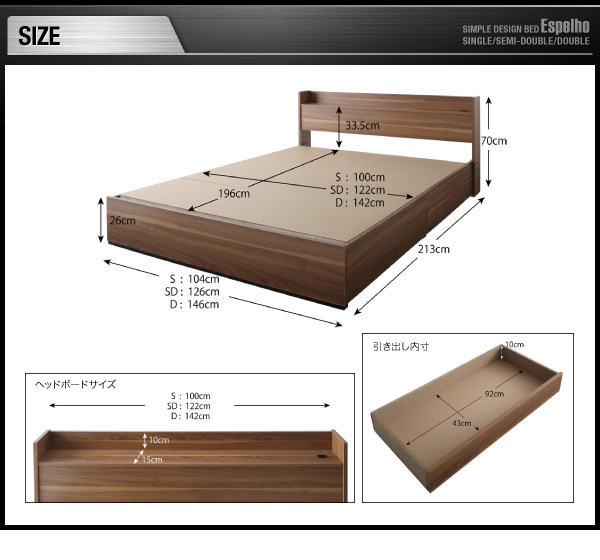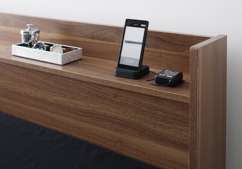 ウォルナット柄・棚・コンセント付き収納ベッド Espelho エスペリオ