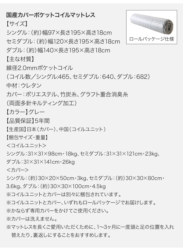 国産カバーポケットコイルマットレス付き / セミダブル / グレー [No.100007029]
