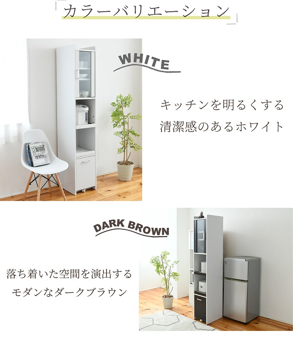 新色ブラックが登場。天板、扉収納、スライド棚2段、引き出しを備えた、スマートキッチンシリーズの家電ラック(高さ180cm)です。隙間に収まるスリムサイズ。家電やストック品の収納をこれ1台で実現。扉収納には、おしゃれな擦りガラスや、便利な可動棚を採用。スライド棚は家電の収納に便利。スライドレールで出し入れでき、2口コンセントも備えています。引き出しは2Lのペットボトルも入る深型で、ストック品の収納に活躍します。天板も棚として活用できます。ホワイト、ダークブラウン、ブラックの3色から選べます。