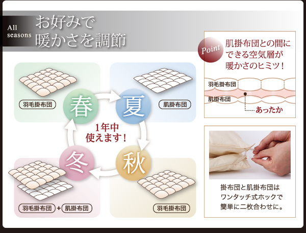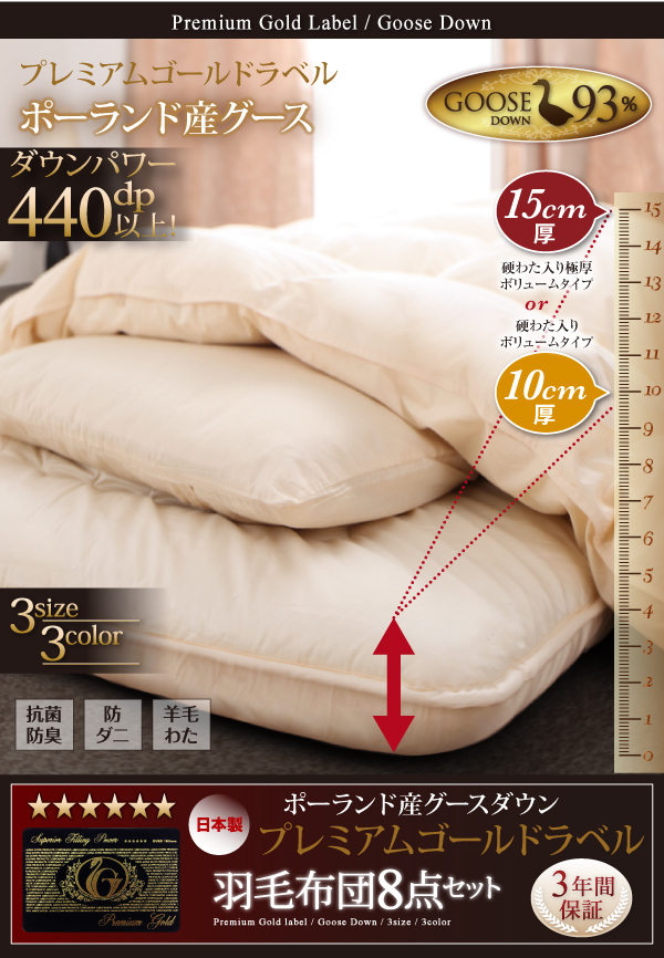 ポーランド産の最高級品グースの羽毛を採用した、プレミアムゴールドラベル取得の羽毛布団8点セット(羽毛掛布団、肌掛布団、枕、敷布団、掛・敷・枕カバー、収納ケース)。敷布団にもこだわっており、10cm厚(ボリュームタイプ)、15cm厚(極厚ボリュームタイプ)から選べます。