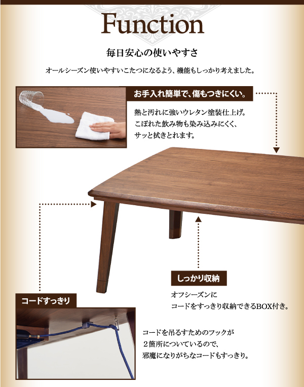 こたつ本体全体に天然木ウォールナット無垢材を採用した、木の温もりが楽しめる、こたつテーブル。シンプルで飽きないデザイン。丸みを持たせた天板ラインが印象的で、美しい仕上がり。2重天板構造を採用し、こたつ布団を掛けた状態でも見た目が崩れません。熱や汚れに強いウレタン塗装仕上げ。5cm継脚が付属。