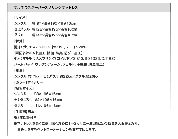 床板仕様 / マルチラススーパースプリングマットレス付き / シングル / ブラック / ホワイト [No.76043]