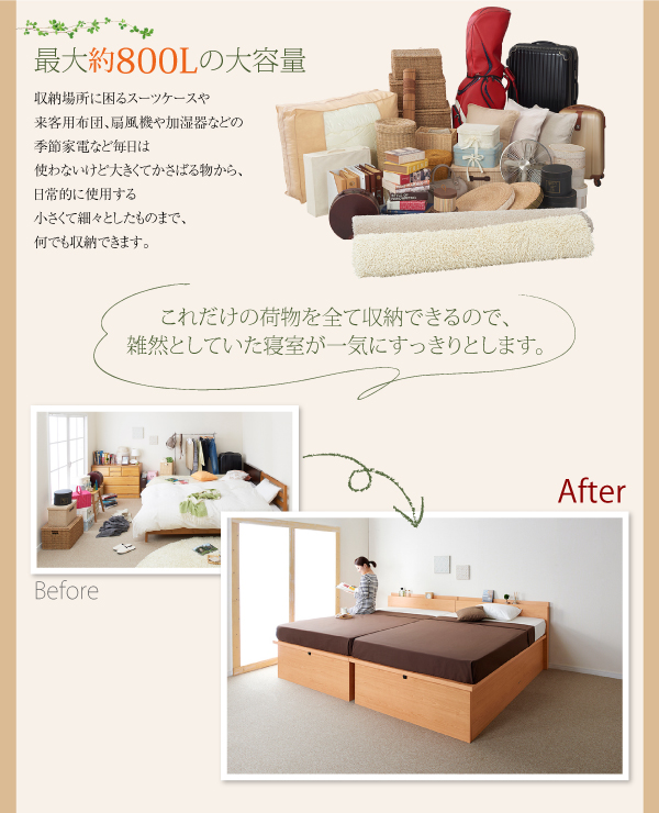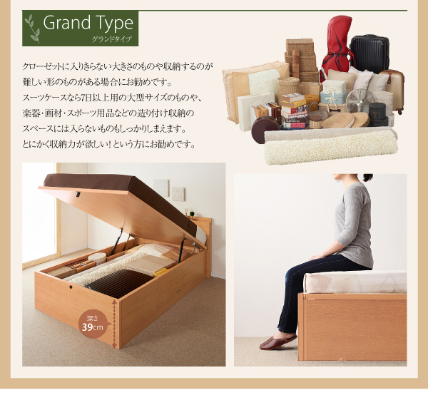 ベッド下を大容量の収納として使える、ガス圧式跳ね上げ収納ベッド。木の風合いを再現したナチュラルカラー。ベッド下深さ(収納量)を約23cm(レギュラータイプ)、31cm(ラージタイプ)、39cm(グランドタイプ)の3サイズから選べます。ガス圧式なので、女性でも楽々開閉可能。収納内部にも床板付き。シリンダーBOXや、マットレス止めなど、安全にも配慮。ヘッドボードは約9cmの薄型。シンプルな棚に、便利な2口コンセントを完備。