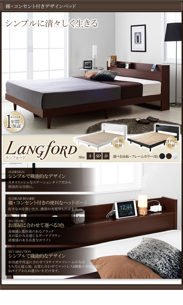 すっきりした印象のステーションタイプのベッド。フロアボードを「床板仕様」、「すのこ仕様」の2タイプから選べます。「すのこ仕様」ではマットレスだけでなく、お布団でもご利用可能。ヘッドボードはシンプルで使いやすい宮棚、便利な2口コンセントを完備。