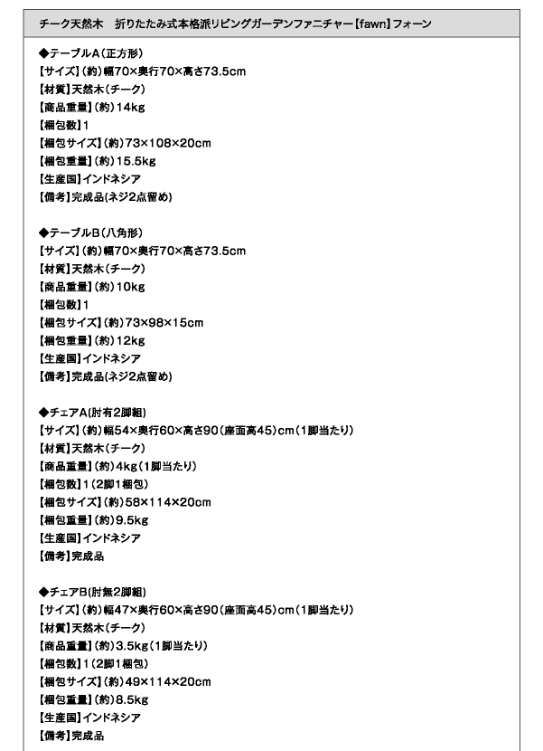 天然木チーク材を採用し、使い続けるほどに味わいが増していくガーデン家具。テラスやベランダなどで活躍します。正方形・八角形のテーブル、肘付き・肘無しのチェア、そして脚付きトレイと豊富なラインナップ。折りたためる仕様だから、コンパクトに収納可能。