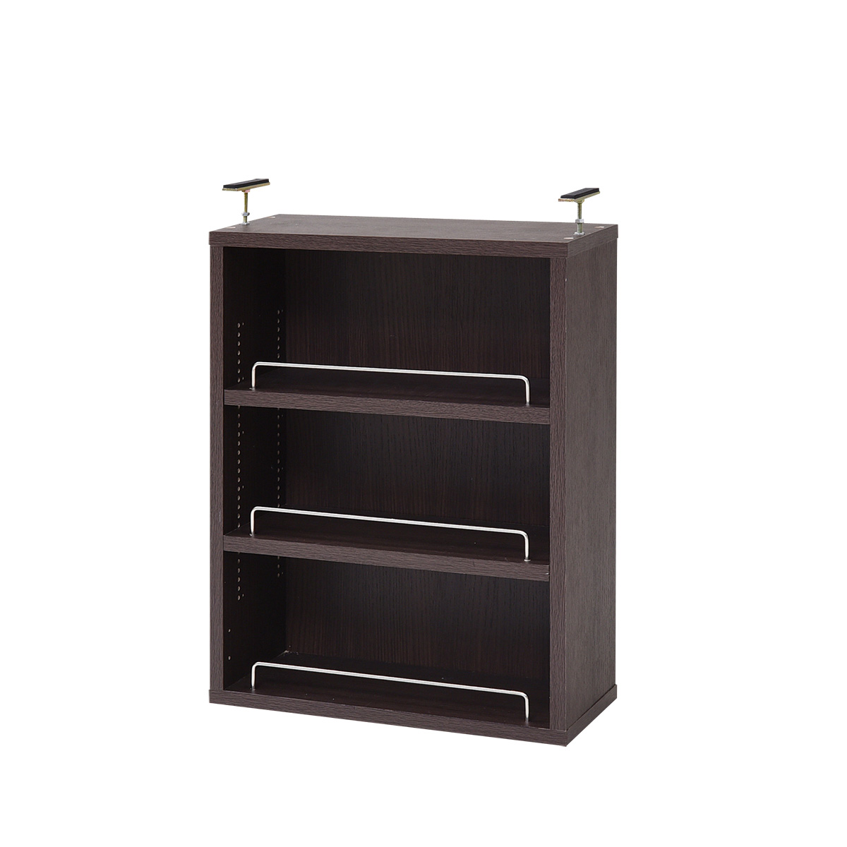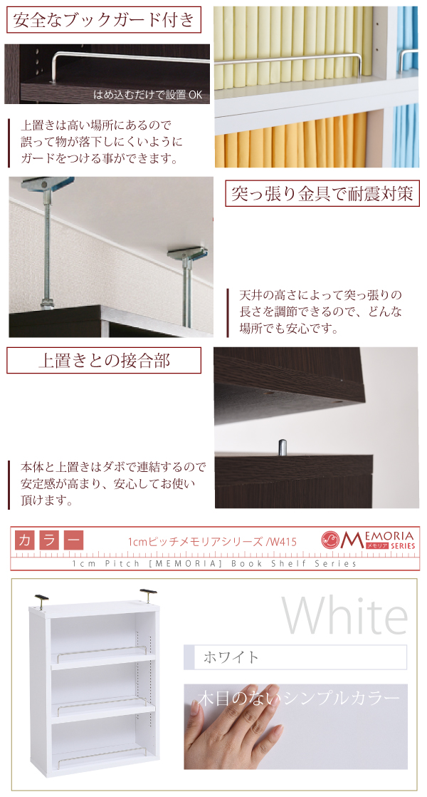 壁面収納書棚、MEMORIAシリーズの薄型幅41.5専用上置き。本体同様に、1cm間隔で棚板の高さ調整が可能。上置きは高所に設置となるため、収納物の落下を防ぐブックガードが付属。取り付け簡単、安心。天井つっぱり機能付きで、収納量だけでなく耐震性もアップ。