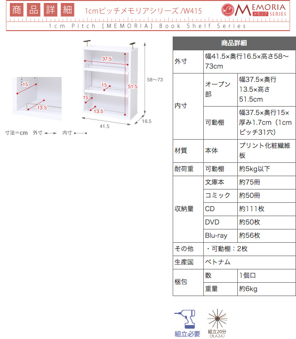 下記ダウンロードボタンから、「MEMORIA 棚板が1cmピッチで可動する 薄型オープン上置き幅41.5 FRM-0103」の組立説明書(PDF形式)をダウンロードできます。