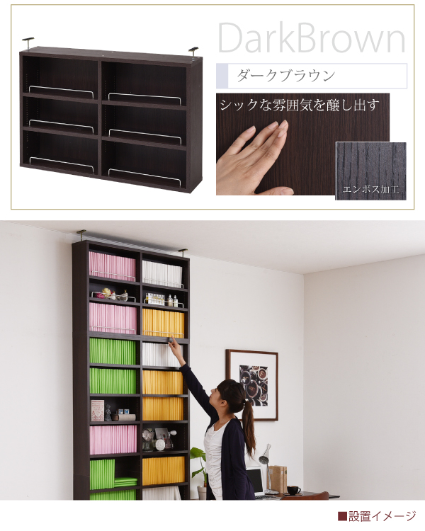 壁面収納書棚、MEMORIAシリーズの薄型幅81専用上置き。本体同様に、1cm間隔で棚板の高さ調整が可能。上置きは高所に設置となるため、収納物の落下を防ぐブックガードが付属。取り付け簡単、安心。天井つっぱり機能付きで、収納量だけでなく耐震性もアップ。