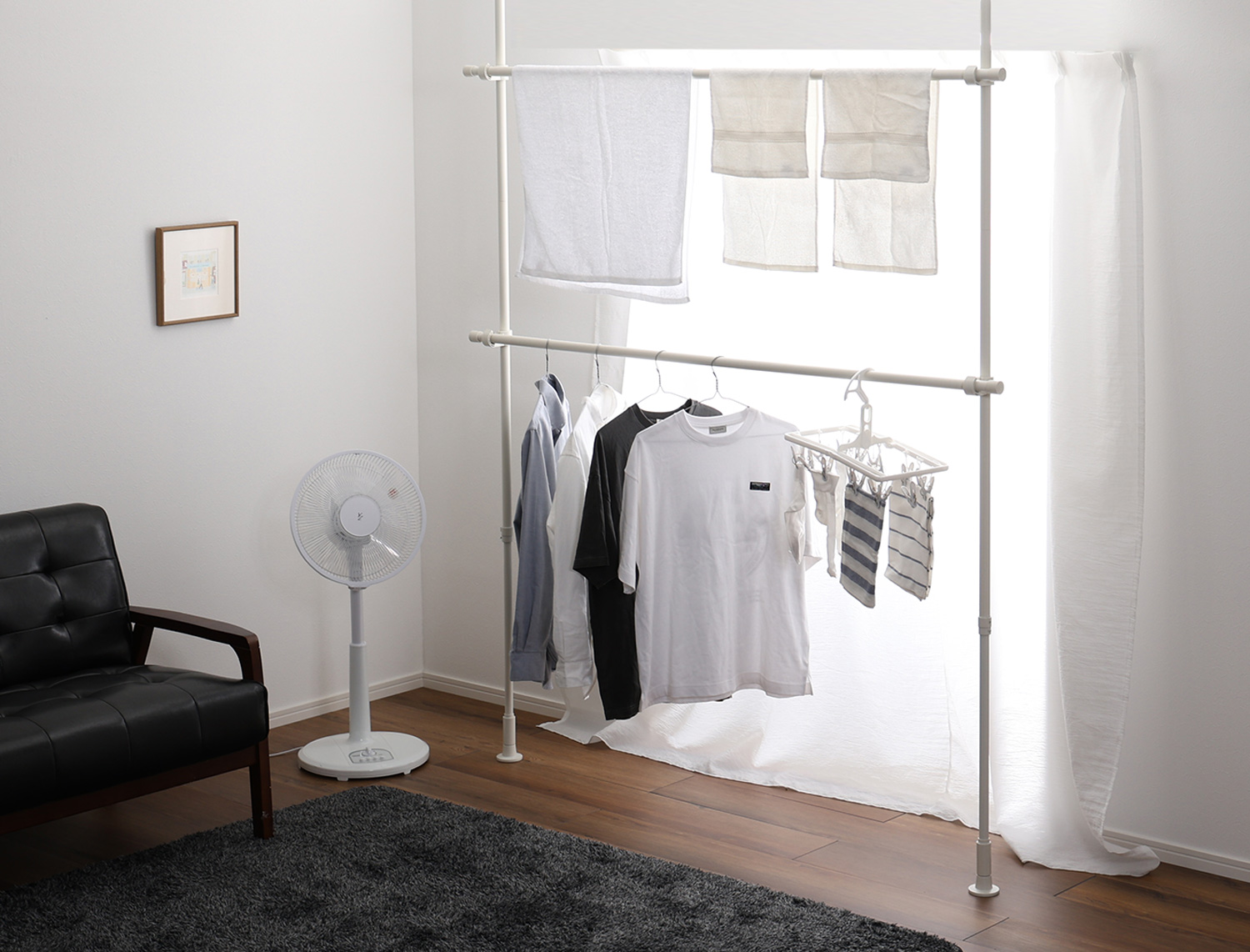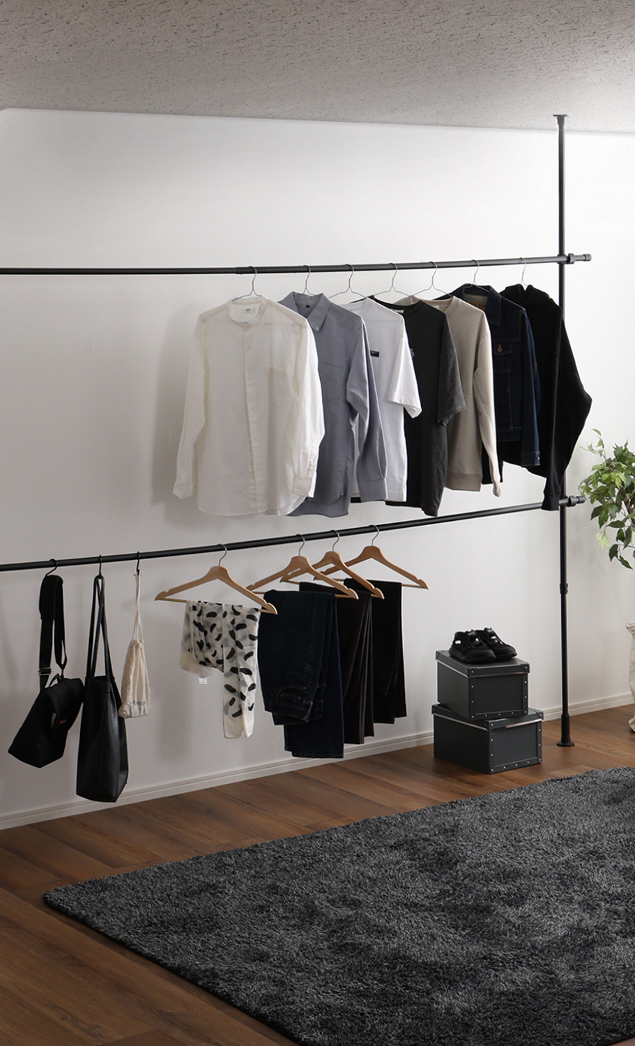 設置場所を選ばない、つっぱりポールハンガーラックの2段タイプ、幅170~250cmサイズです。天井高205~275cmのスペースに設置が可能です。表面には梨地加工が施され、シンプルながら高級感を演出。横ポールの高さは無段階で調節可能。伸縮機能付きだから、横幅も調節可能です。ブラック、ホワイトの2色から選べます。