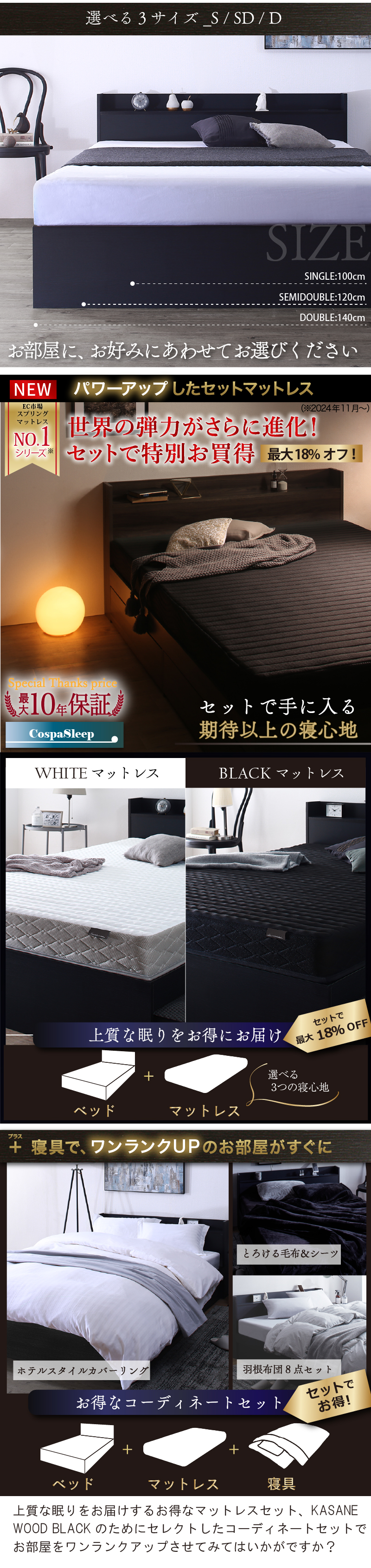 このページは商品名「棚 コンセント付き 引き出し収納ベッド Ever X エヴァー エックス ウッドブラック」の、バリエーション「組立設置付き / マットレス&とろける毛布とシーツ付 / ベストセラーモデルマットレス / シングル / ホワイト / サイレントブラック [No.500078333]」の販売ページ(個別ページ)です。