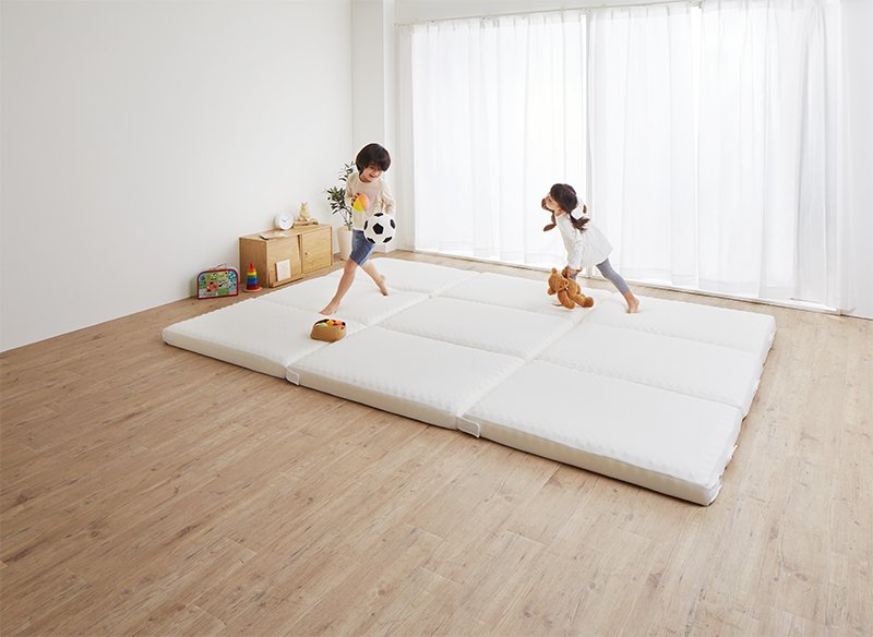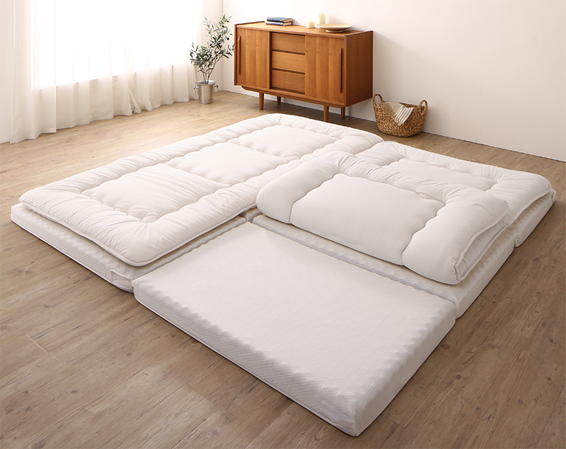 家族みんなで眠れる、ワイドキング300cmのひろびろファミリーマットレス敷き布団です。約8cm厚のボリュームタイプ。安心の1年品質保証。コンパクトに収納できる三つ折りマットレスを組み合わせてワイドサイズを実現。つなぎ目はワンタッチテープで固定できます。分割しても使えるので、使い方が広がります。カバーは取り外して洗えます。トリプルエアスルーで通気性抜群。弾力性と復元性に優れた超熟ウレタン。ノンホルムアルデヒド仕様でお子様も安心です。お部屋への搬入も楽な、圧縮梱包でお届けします。